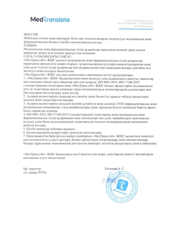 «МедТранслэйт» ЖШС қызметі медициналық және фармацевтикалық аударымдар нарығының ерекшелігін ескере отырып, тұтынушылардың талаптарын қанағаттандыратын және одан да асып түсетін медициналық аударымдар мен аударма қызметтерінің жоғары сапа деңгейіне қол жеткізуге және қолдауға бағытталған.